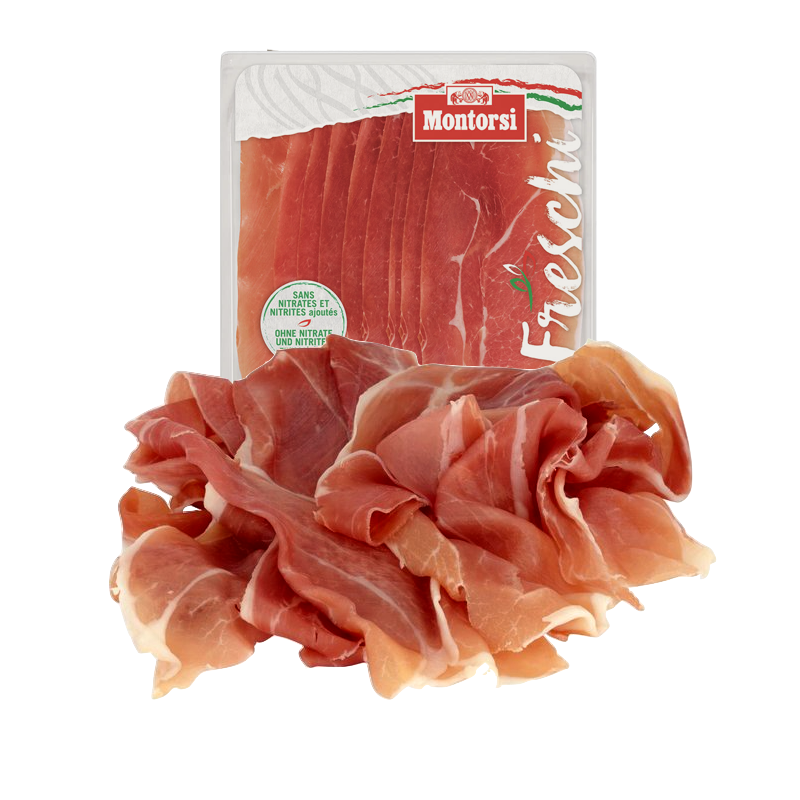 Prosciutto Crudo, laminado e interfoliado. El jamón crudo italiano en general se destaca por erstar madurado en los valles de la región Emilia-Romagna por donde corren vientos desde el Mar Adriatico hacia los Alpes y vice versa, resulta en un jamón madurado mas dulce y sabroso. Usalo para panini, antipastos y en tu pizza una vez horneada. Una nueva forma de prepararlo es ponerlo en una plancha o sartén y cocer hasta que quede crocante, luego lo mueles sobre un plato de pasta o tu receta favorita para darle textura.